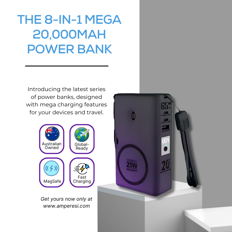 This powerhouse seamlessly integrates six essential functions: an ENORMOUS 20,000mAh Power Bank, a Wall Charger, built-in Lightning and USB-C cables, MagSafe-compatible wireless charging, and Universal Travel Adapters (AU, US, EU, UK).